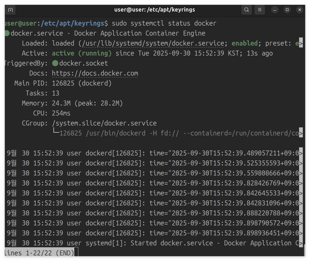 systemctl status로 Docker 데몬 상태를 확인하고, 실행 중이 아니면 start 명령어로 시작합니다. Ubuntu에서는 설치 후 자동 실행되지만, 확인 차원에서 체크하는 게 좋습니다.