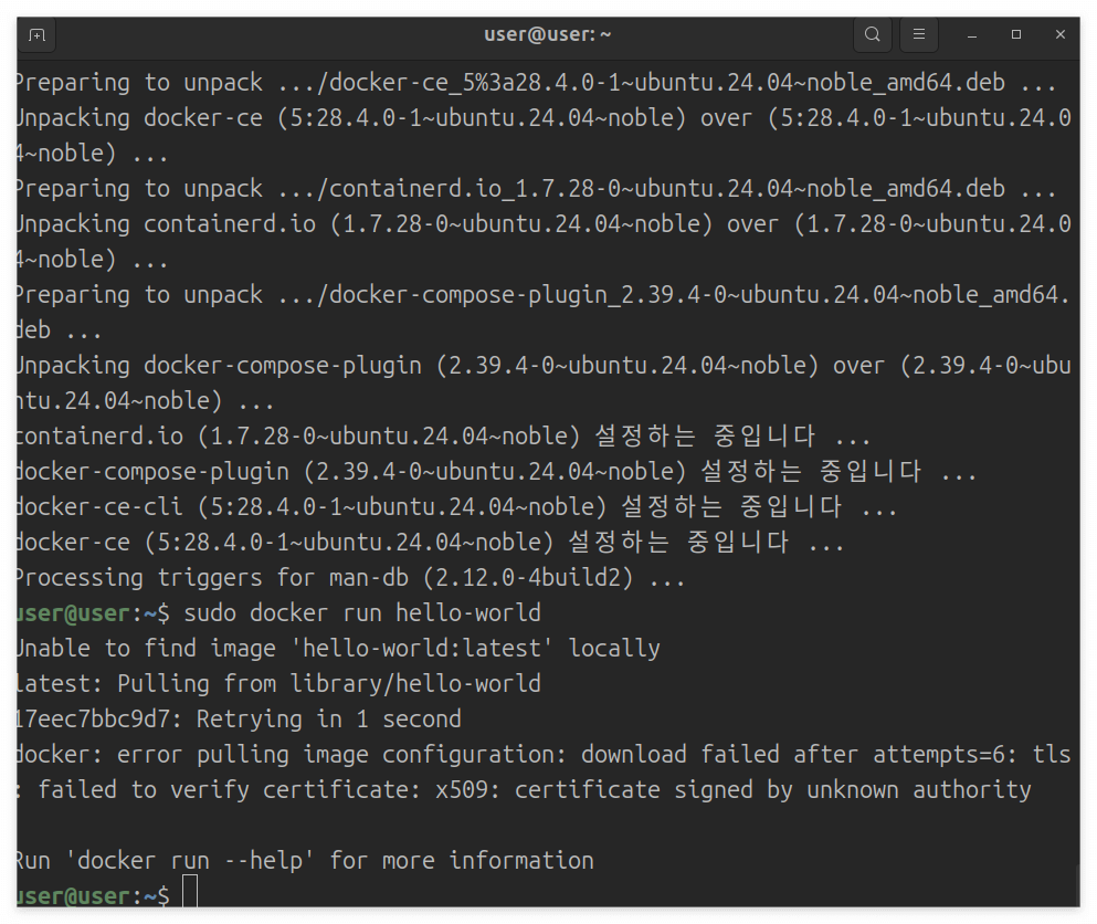 프록시 CA 인증서를 /usr/local/share/ca-certificates/에 복사하고, update-ca-certificates로 시스템 인증서 저장소를 갱신합니다. Docker 데몬을 재시작해야 변경사항이 적용됩니다. your-proxy-ca.crt 부분은 실제 인증서 파일명으로 바꿔야 해요.