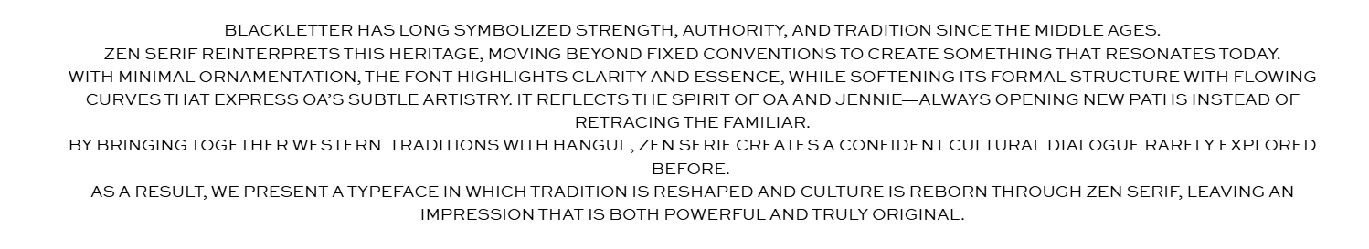 Blackletter is a script used since the Middle Ages, symbolizing strength, authority, and tradition. ZEN Serif breaks away from that fixed image and reimagines it through a modern lens. By minimizing ornamentation to emphasize essence, softening rigidity, and adding fluid curves, it captures OA’s signature delicate artistry.