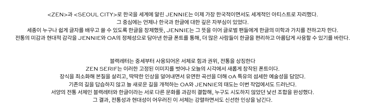 Download ZEN Serif now and express the beauty of Hangul in your work. Experience, in your own projects, the aesthetic Jennie wanted to convey.