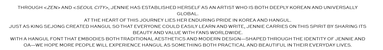 Just as Jennie’s album tracks “Zen” and “Seoul City” introduced Korea to the world, ZEN Serif aims to share the beauty of Hangul through type. Like King Sejong—who created Hangul so everyone could easily learn and write—Jennie seeks to convey the aesthetics and value of Hangul to global fans.