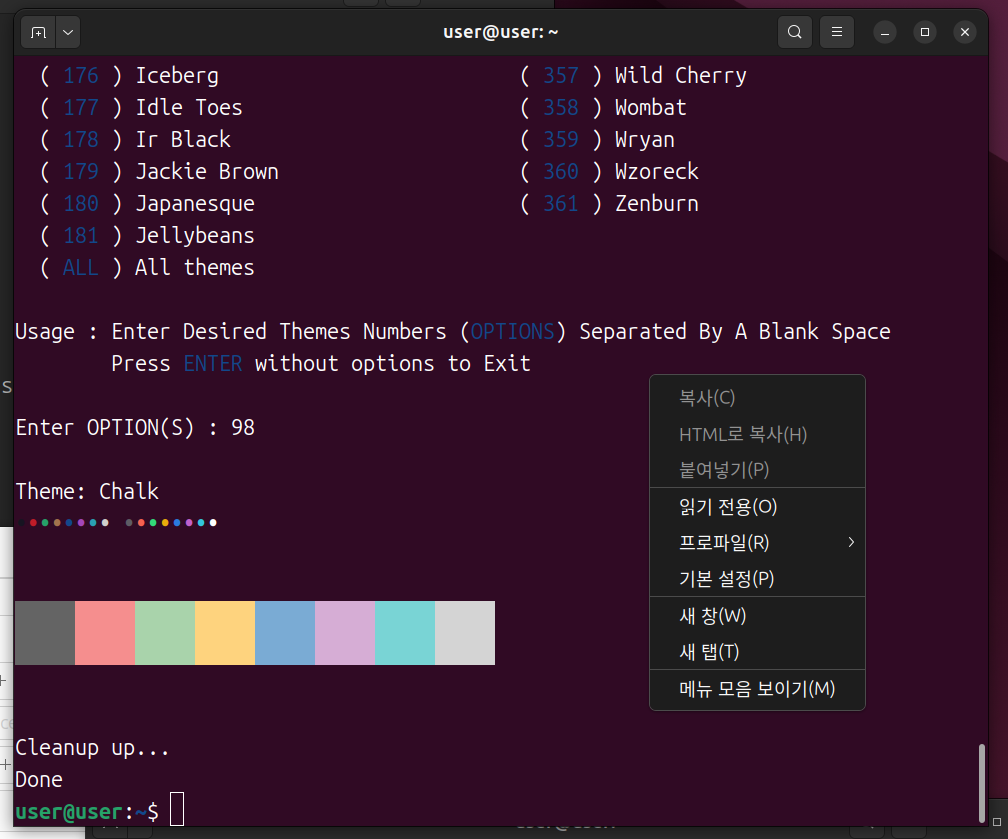 번호 입력 후 엔터를 누르면 새 프로필이 생성됩니다. 터미널 창에서 우클릭 > Profiles 메뉴를 보면 방금 설치한 테마 이름이 보입니다. 그걸 선택하면 색상이 바로 바뀝니다.