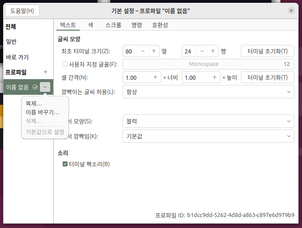 마우스 우 클릭 하시면 기본 설정 들어가실 수 있습니다 - Profiles 탭 클릭 > 이름 바꾸기 하셔서 default_profile로 이름 변경