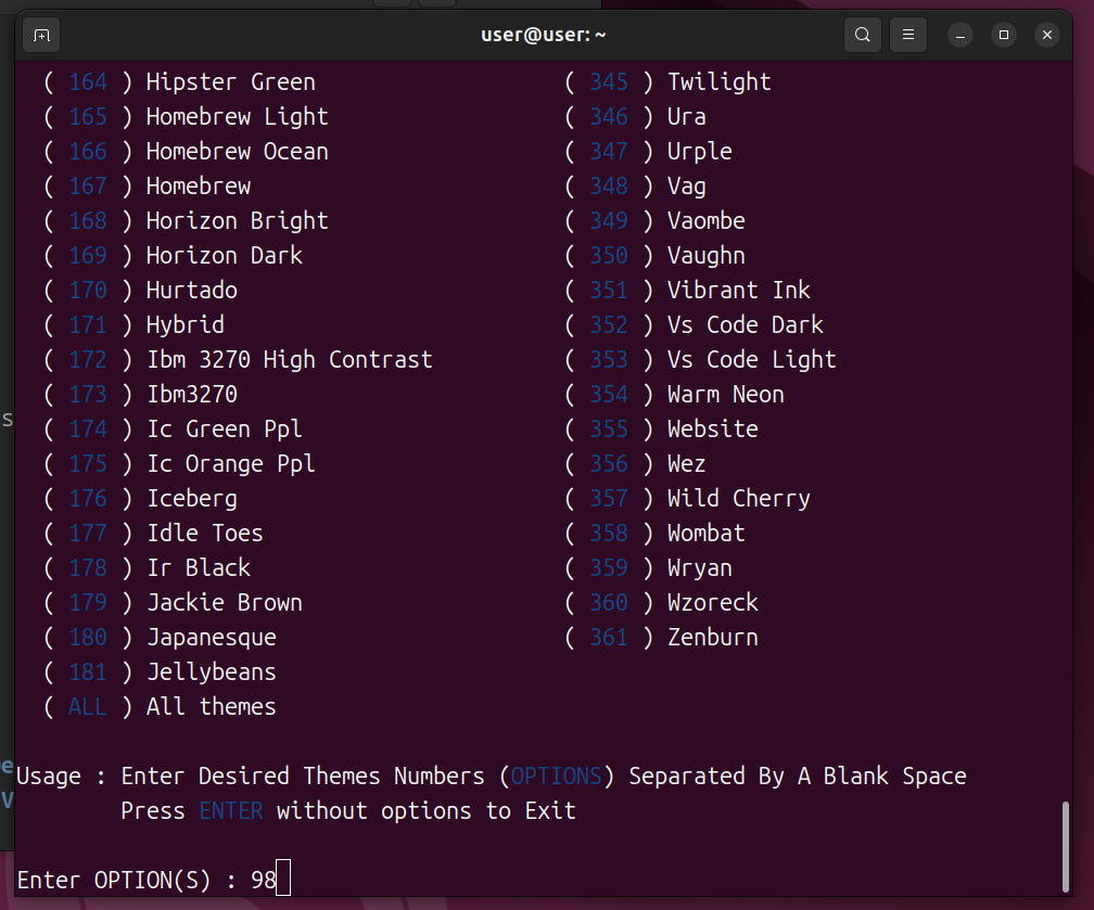 실행하면 1번부터 200번 넘게 테마 목록이 쭉 나옵니다. 원하는 테마 번호를 입력하면 바로 적용됩니다.